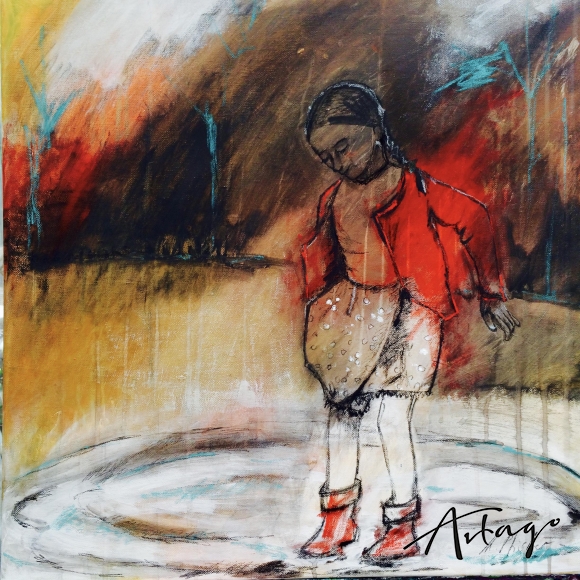 Das Bild ist 50cm x 50cm gross und zeigt ein Mädchen mit Stiefeln in einer Pfütze stehend.