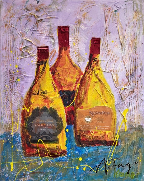 Das Werk Round Hill zeigt drei Weinflaschen in einer abstrakten, farbintensiven Komposition. Durch den Einsatz verschiedener Materialien und Texturen entsteht ein vielschichtiges Spiel zwischen Form und Fläche. Die Rundungen und Farbverläufe verweisen subtil auf den Namen des Werks – Round Hill – und verleihen der Darstellung eine harmonische, zugleich dynamische Wirkung.